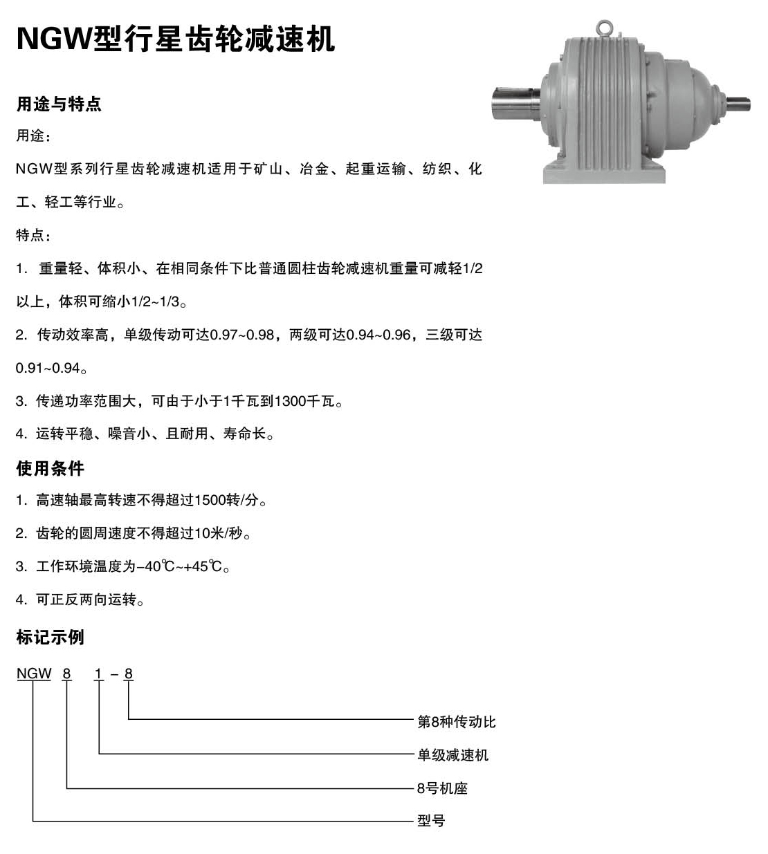 NGW型系列行星齒輪減速機(jī)適用于礦山、冶金、起重運(yùn)輸、紡織、化工、輕工等行業(yè)。